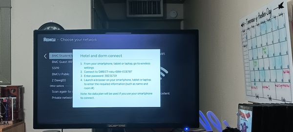 I just bought a roku stick for my dorm room. It wont connect to my school's wifi. Every time I try to set it up, my phone won't allow me to select the network it tells me to. And I cant change anything on the TVs setting because I can't do anything on the TV until I get it connected to the network. When I try to use my tablet, it says something about many devices being on the network and it tells me to restart the router, which I obviously can't do. I've tried resetting my network connection too. Nothing's working.