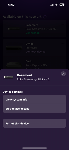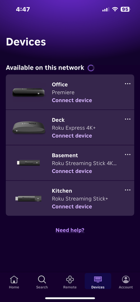 It looks like you're still having trouble locating your device on the Roku mobile app. Could you try accessing it through a different browser to see if the issue continues?