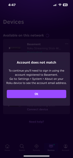 We see that you're also experiencing the issue. To help us isolate the issue, could you please try checking if it's the same Roku account you signed in with the device and app?